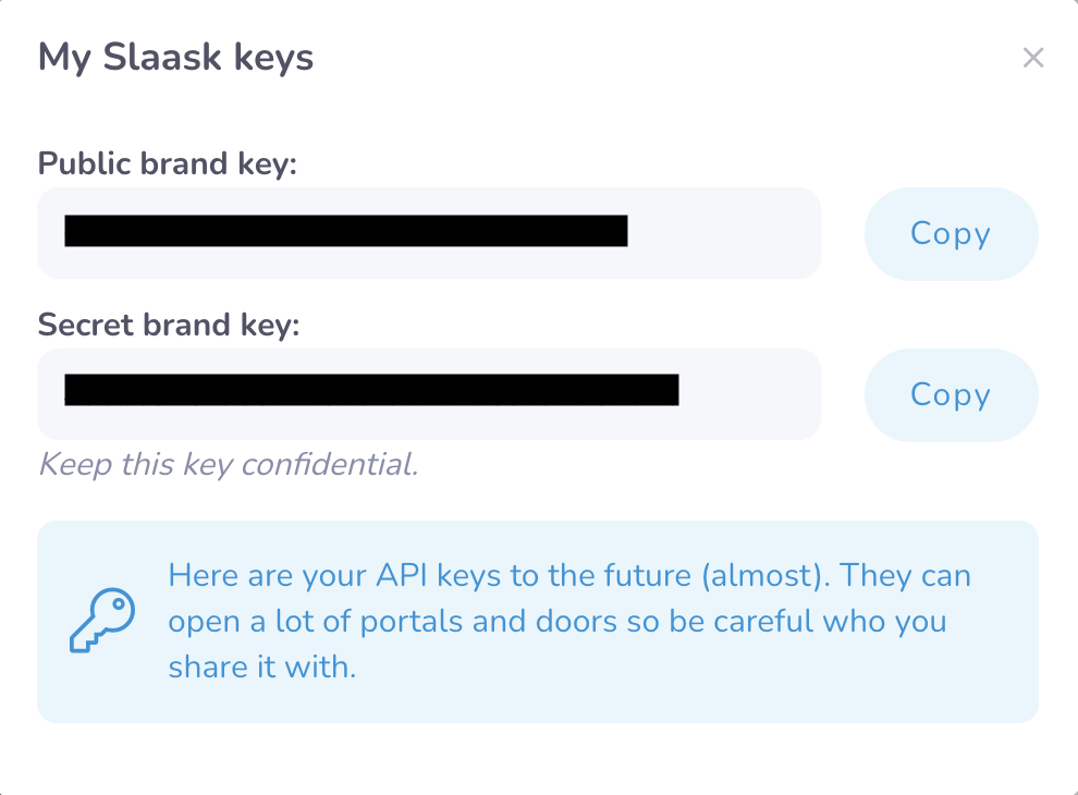 Please note these keys are confidential, they ensure the security of your data, so be careful who you share it with.